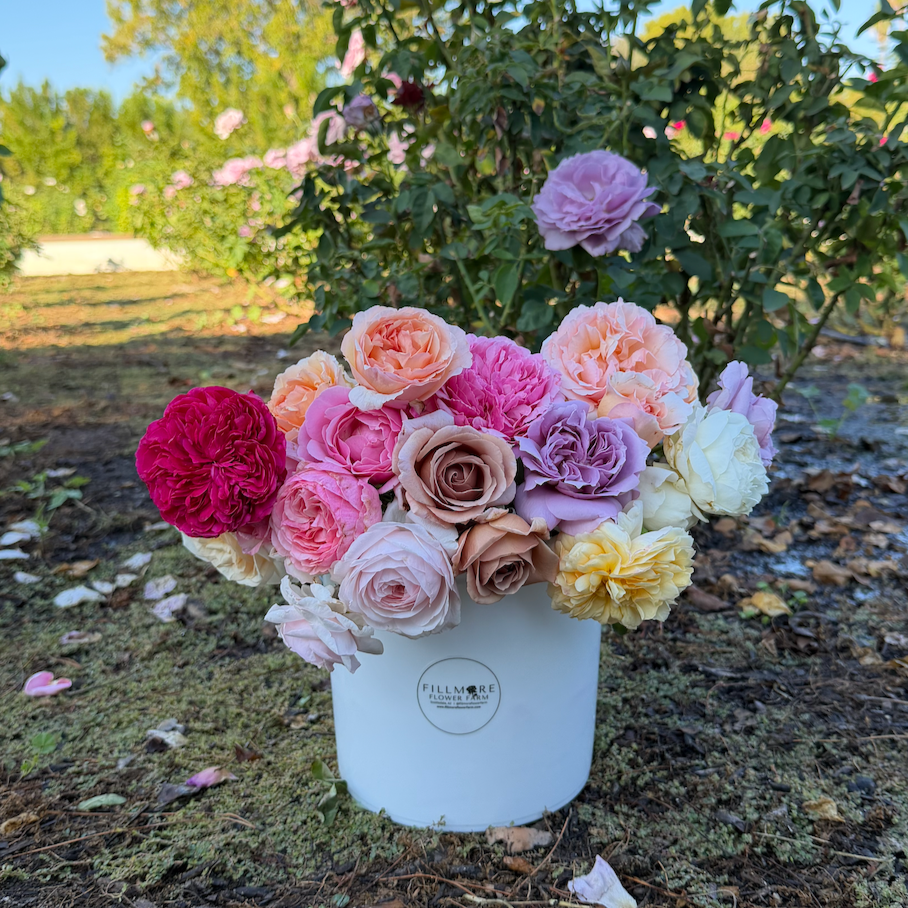 At Fillmore Flower Farm, we grow garden roses and seasonal blooms known for their beauty, fragrance, and character. These aren’t the long-stemmed roses commonly found in grocery stores. Garden roses are filled with lush petals, soft textures, and incredible natural fragrance. People are often amazed by how wonderful our roses smell—something that has largely been bred out of many commercial roses.